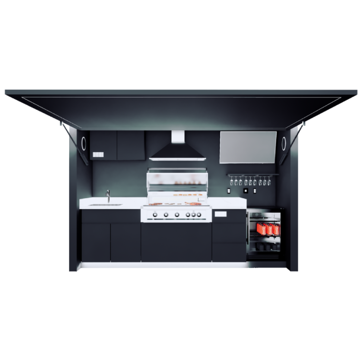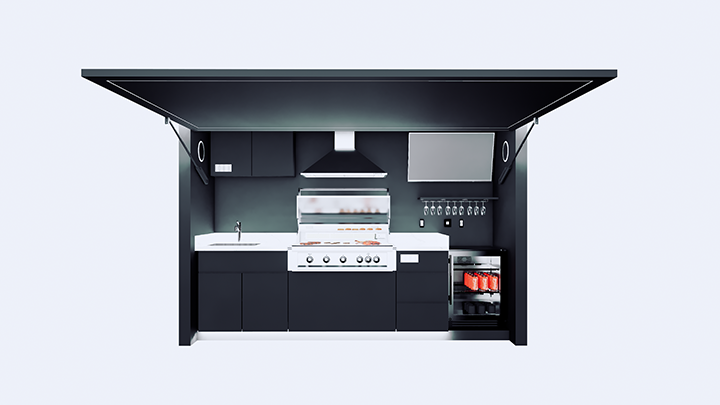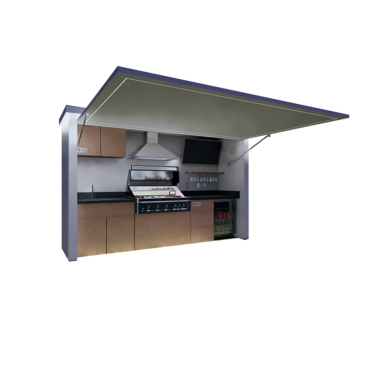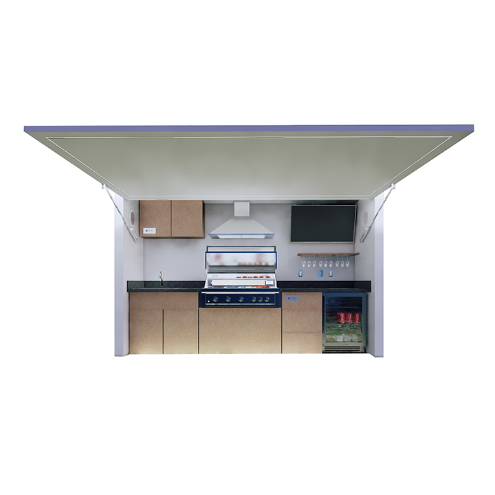 Effortlessly open your outdoor kitchen with a touch, thanks to the powerful electro-hydraulic lift system designed for modern living.