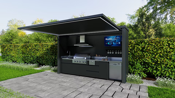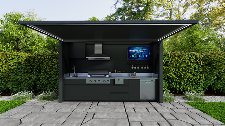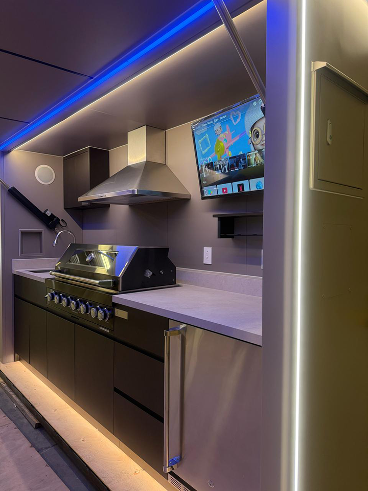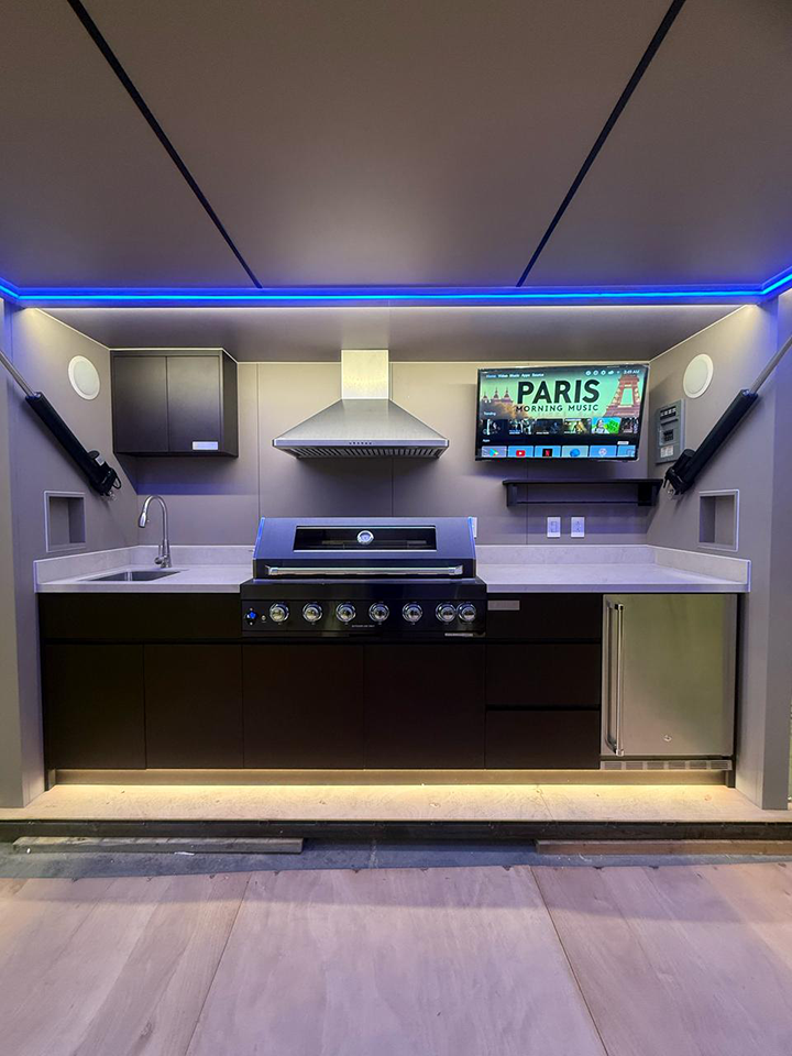 Weatherproof 26' (XL) or 42' (XXL) Smart TVs and in-wall Bluetooth speakers turn every cookout into a cinematic, music-filled experience.